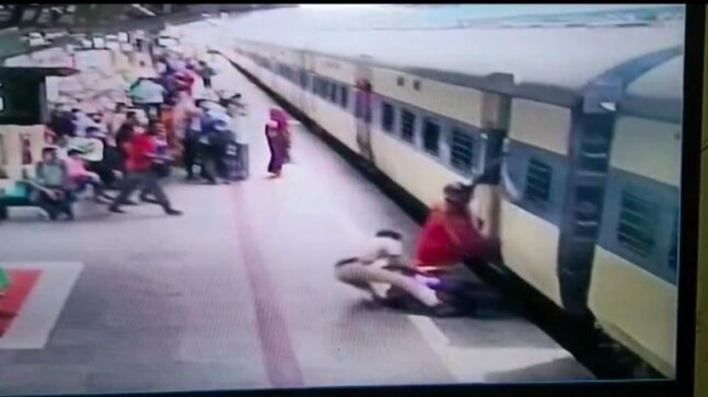 Constable pulls woman to safety from moving train in Bhubaneswar railway station | Watch